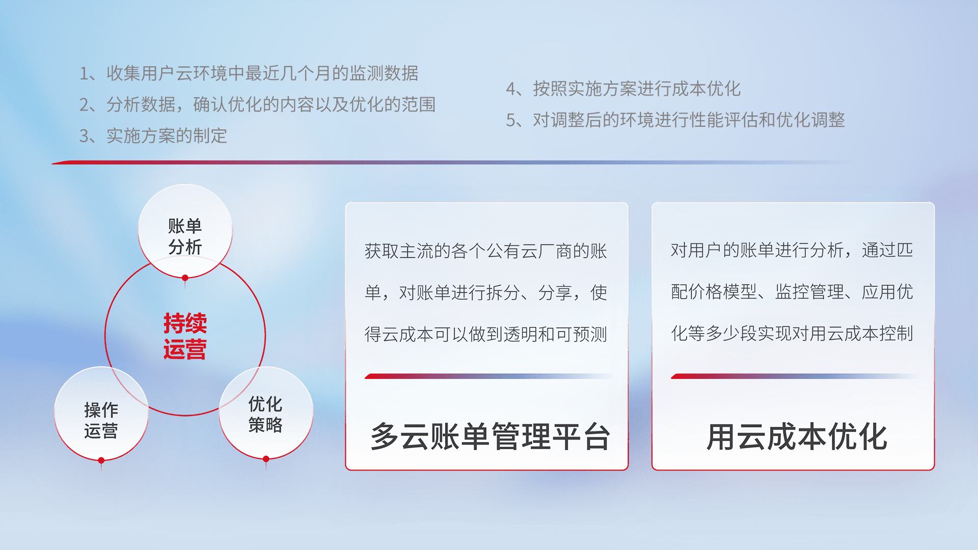 通过多云纳管,,,以统一的资源数据模型把客户的云资源进行抽象和封装,,进而实现对多云资源的统一操作,,,保障云资源管理的可靠性、、稳定性与可用性。。。量身定制化运维内容,,配置、、开发运维、、、、补丁管理、、、、备份、、监控、、、认证和访问管理、、审计和日常巡检等,,,,保障在用云过程中的可靠度,,,稳定度以及高可用率。。。